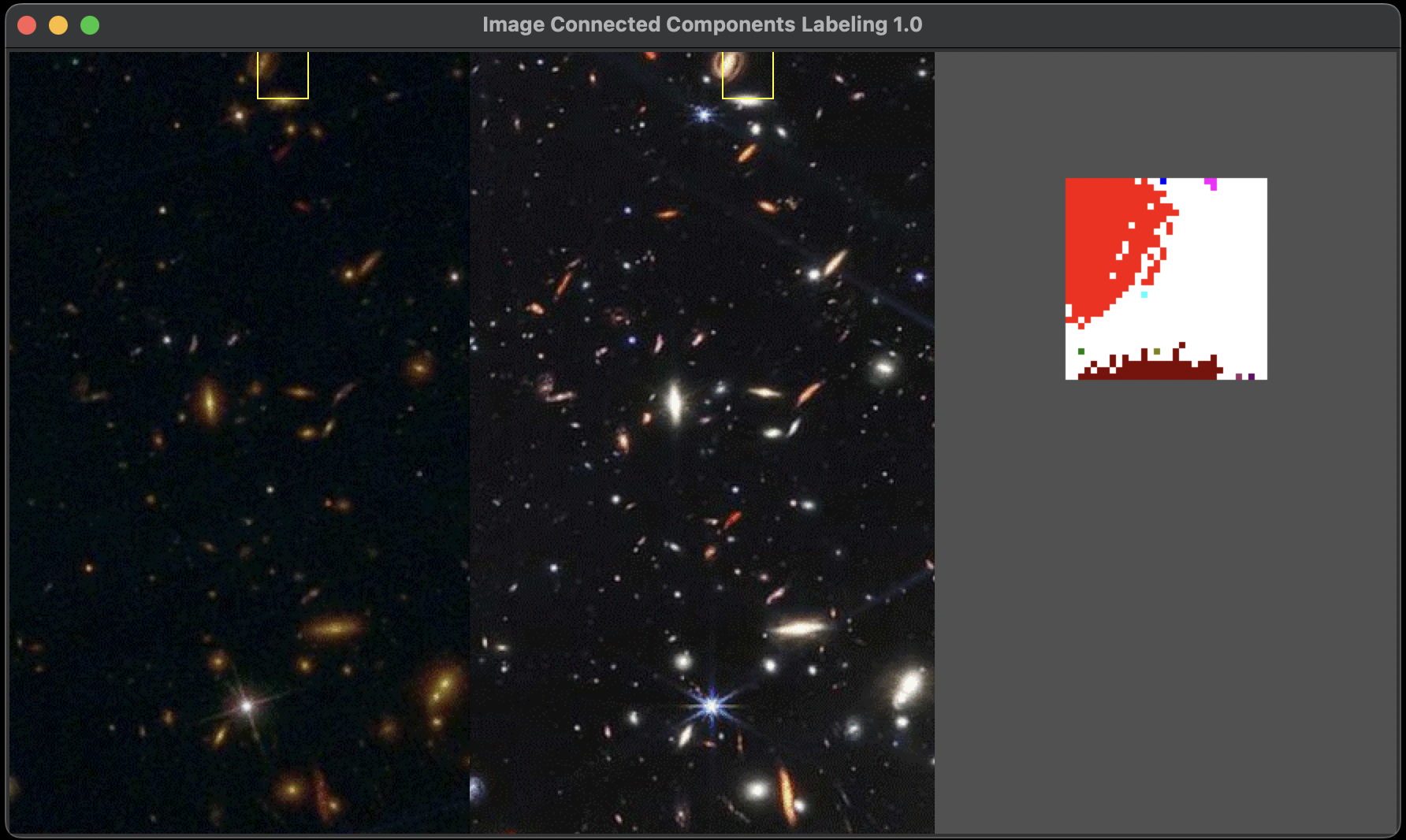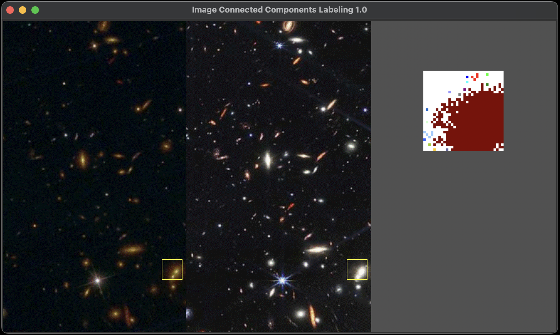 In the examples above, the picture at the left represents the result from the first pass of the algorithm, while the picture on the right displays the outcome after the second pass. In the MIPS Assembly implementation, the image is colorized directly within the assembly code after the completion of the two-pass algorithm.